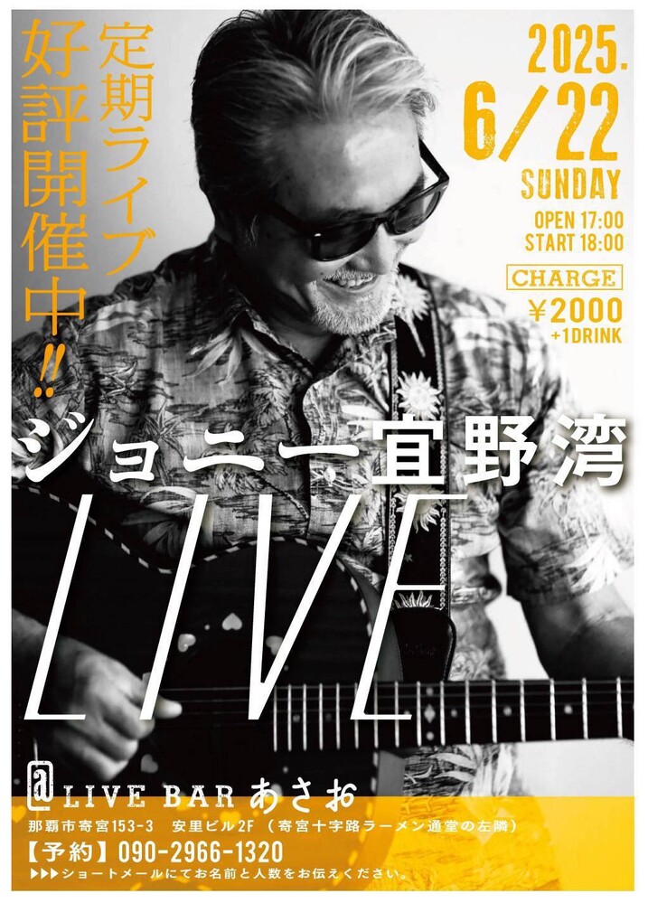 ◆6/22(日) 「ジョニー宜野湾ライブ」 歌と楽しいおしゃべりであっという間の2時間♪ 【時間】OPEN17:00/START18:00 【料金】¥2,000 +1ドリンク 【場所】「LIVEBarあさお」 那覇市寄宮153-3-2階 (寄宮十字路ラーメン通堂の左隣) ※駐車場はありません。近隣の琉球銀行寄宮支店のコインパーキングがお安く便利です 【ご予約】 各アーティストかお店090-2966-1320 ショートメールにて日にち、お名前と人数をお申し込みください。