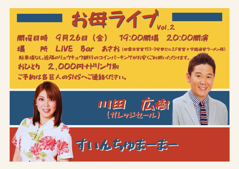 ◆9/26(金) 【お母ライブVol.2】 【出演者】川田広樹(ガレッジセール)、すいんちゅまーまー 【時間】OPEN19:00/START20:00 【料金】¥2,000 +1ドリンク別 【場所】「LIVEBarあさお」 那覇市寄宮153-3-2階 (寄宮十字路ラーメン通堂の左隣) ※駐車場はありません。近隣の琉球銀行寄宮支店のコインパーキングがお安く便利です 【ご予約】 各アーティストかお店090-2966-1320 ショートメールにて日にち、お名前と人数をお申し込みください。